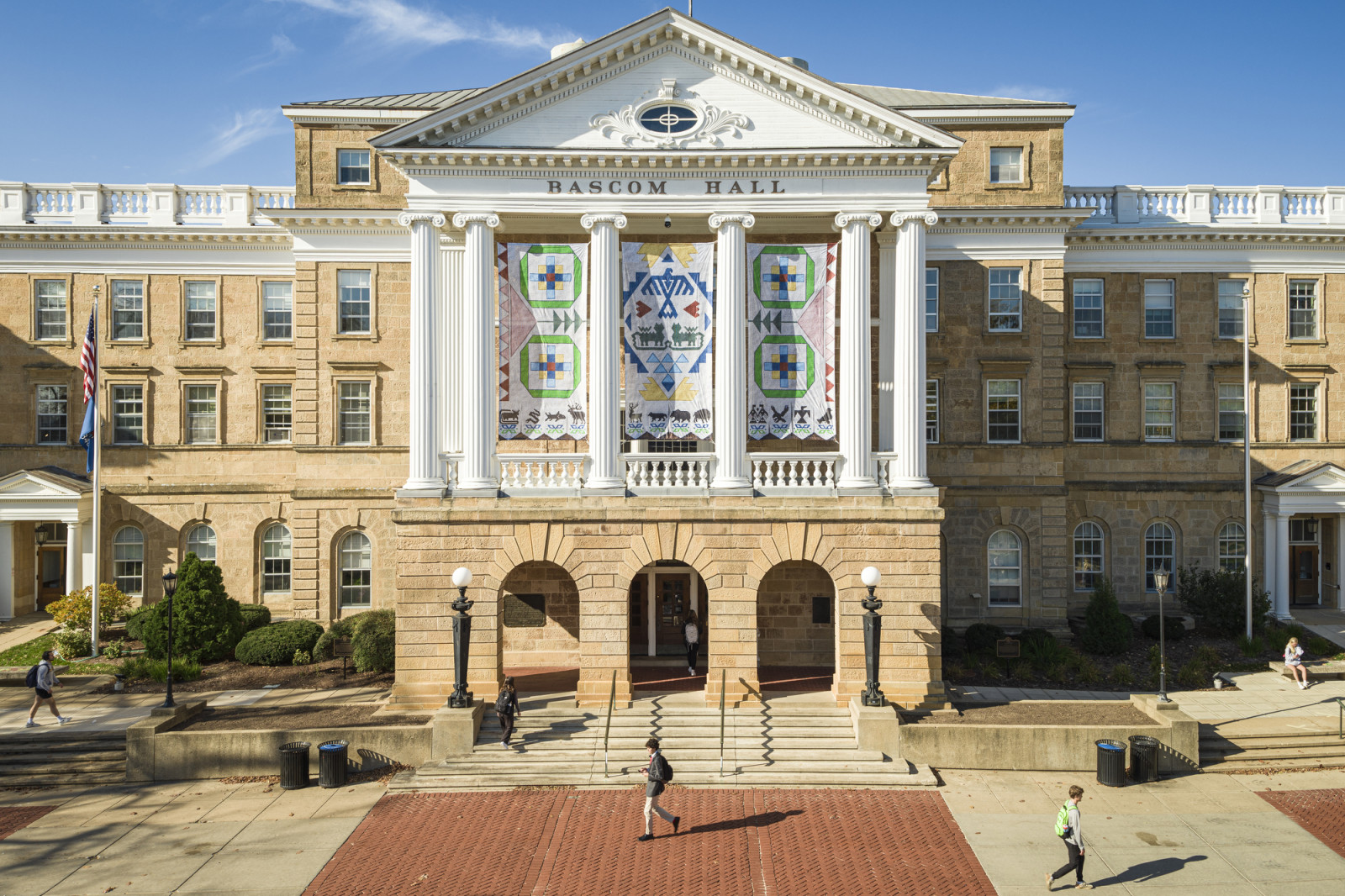 At a special ceremony held Tuesday, Nov. 7, the UW–Madison campus community and invited guests celebrated the installation of Ho-Chunk banners on Bascom Hall, commissioned as part of the University of Wisconsin’s 175th anniversary. The university occupies land that was the ancestral home of the Ho-Chunk.