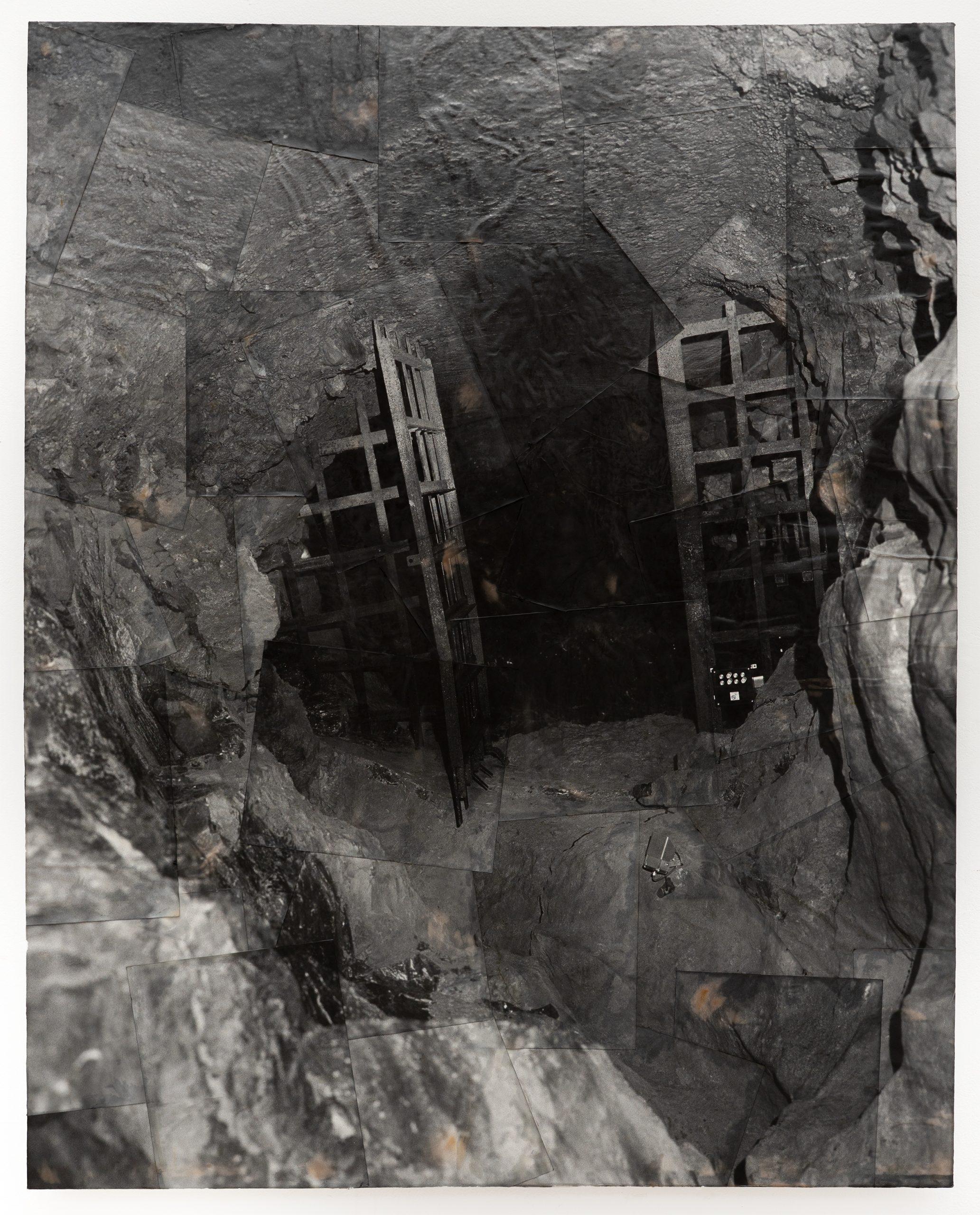 Back home in the darkroom, I blew up the photograph and made about 50 silver gelatin prints of the pieces of the photo, which I then collaged together, mounted to wood, and covered with encaustic (a beeswax + resin combo that some painters use). Many of the pieces in the show are treated similarly with this collaging + encaustic process; working with images of voids feels so tricky sometimes, like they’re almost too challenging to confront head on — so there’s something about covering them with an opaque layer of stuff that allows them to be approached more readily.