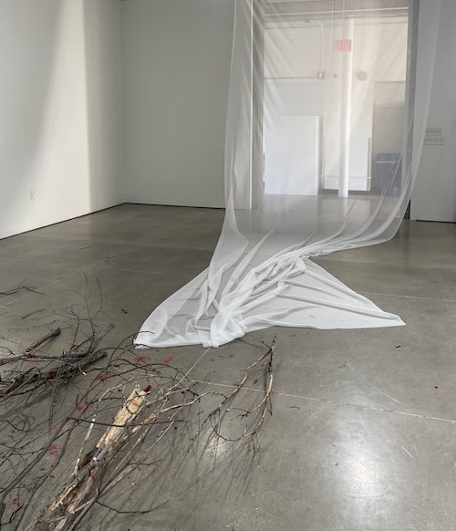 The first image (with brances) is from installation tests I did last year for my exhibition, “Transmutation.” I was inspired to use sheer fabric for that show and my upcoming show because of its spiritual quality: the see-through textile has a ghostly feeling to it. Trauma healing sometimes feels like being a ghost, and the fabric conveys this feeling of being invisible yet visible.