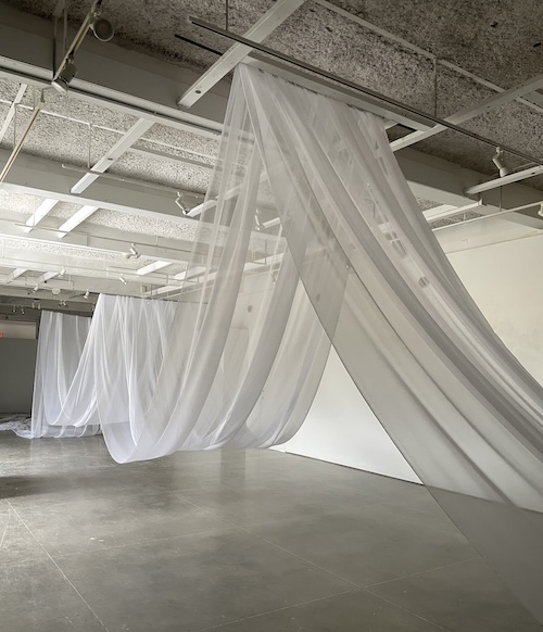 The second image was taken while I was doing installation tests for my thesis show. Using similar see-through fabric, I wanted to float the fabric through the entire pathway of the gallery to highlight the in-between space of this gallery that is also an architectural hallway. I’m inspired by pathways and what they symbolize, and using the fabric in this way brings the ghostly quality of healing to the forefront of the path.