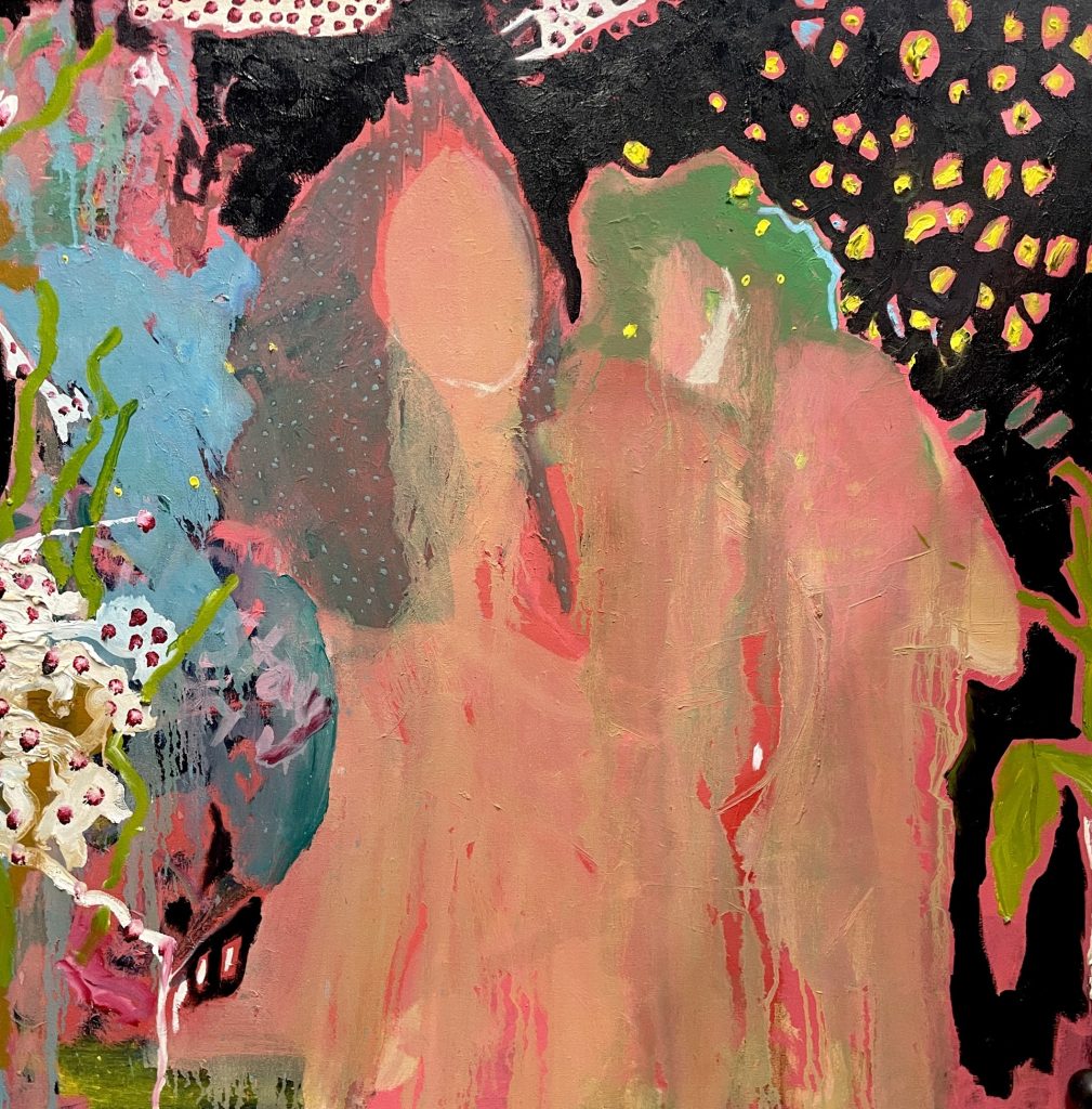 My paintings often evolve and find their compositions as I work on them, usually wet-on-wet painting. While the social practice components of my work often involve detailed planning and documentation, painting is much more of an intuitive space for me to work. My figures emerge from gestural marks and find relationships to each other as the paint accumulates.