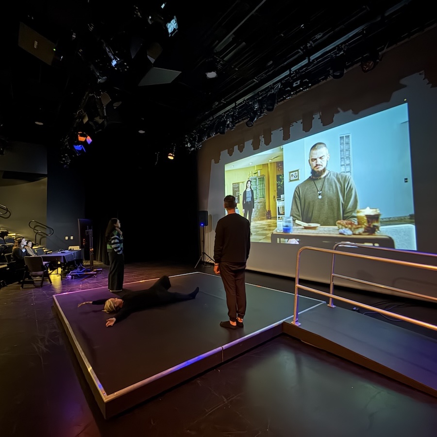 Viewers sit, stand, or lie down on a 12-by-12-foot platform to experience Omari Carter’s “Our Vibes: A Vibrotactile Screendance Installation.” (Photo: Mariah Moneda)