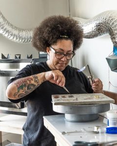 Crane uses the technique on enamel, though it is traditionally applied to pottery. The technique lends her work “a meticulous level of detail and a mesmerizing clarity in design” that, along with her pedagogy, has earned her a 2024 United States Artists Fellowship.