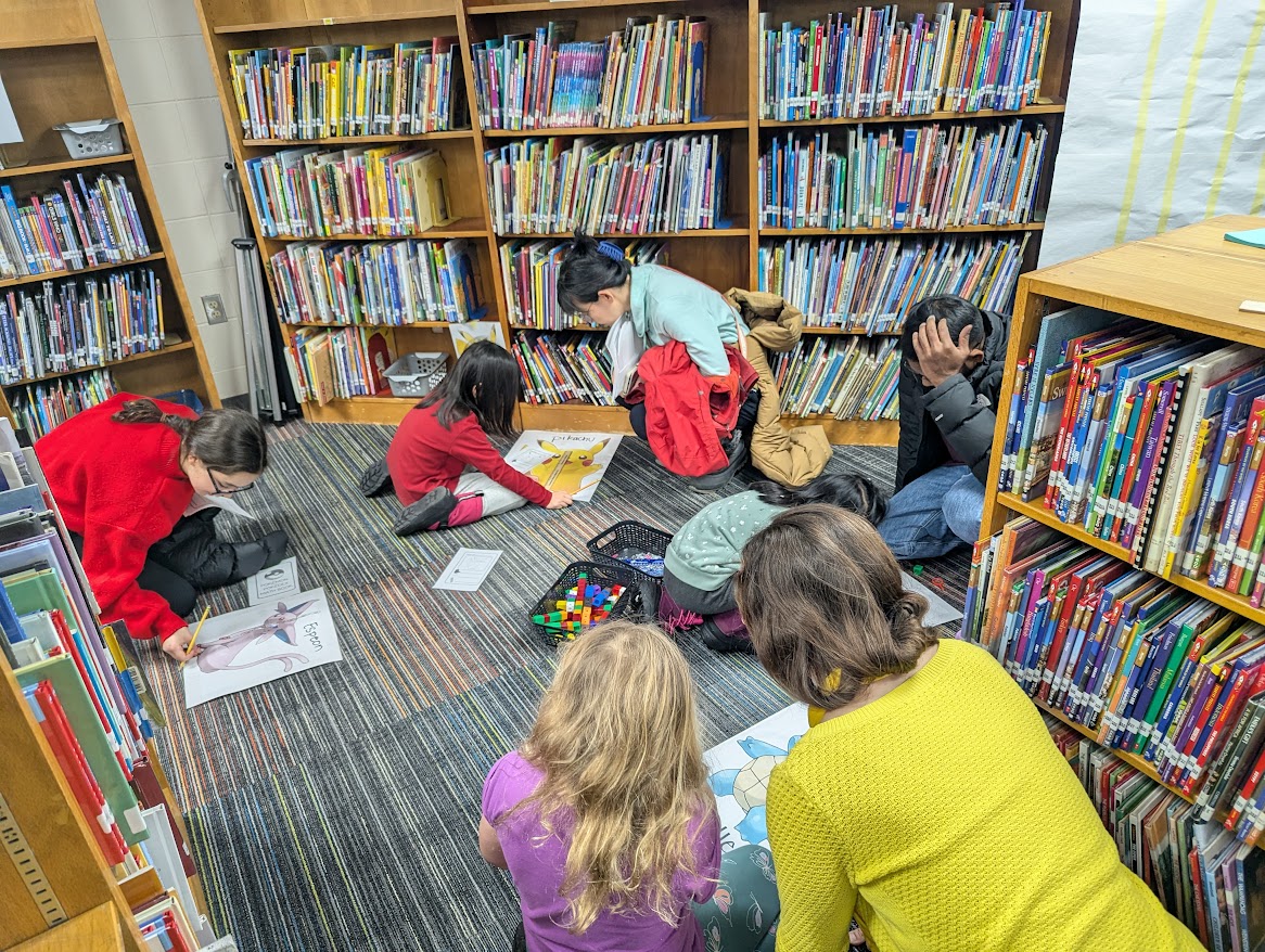 Cian, a kindergartener, sprawled on the floor of the library with a wooden ruler to measure the nose and whiskers on an illustration of Espeon, a pink, cat-like Pokémon character. Friends clustered around him, eager to add Espeon’s stats to their worksheets.