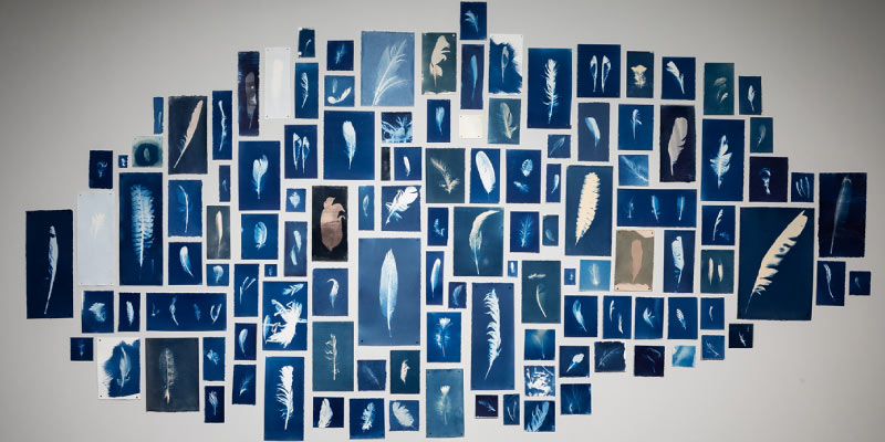 “Feathers, rescues” from the exhibition “Thresholds.” Medium: unique toned cyanotypes, size varies. (Photos by Tomiko Jones)